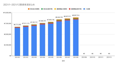 どーも、ちこです。 2021年8月の投資状況をまとめました。 ◆2021年投資状況まとめ ◆入金額 ◆譲渡損益(税引後) ◆配当金(税引後) 今月は配当で+49,903円、入金で+200,000円、 前月から合わせて+249,903円増えました。 8月は割りかし配当の多い月でしたねー…